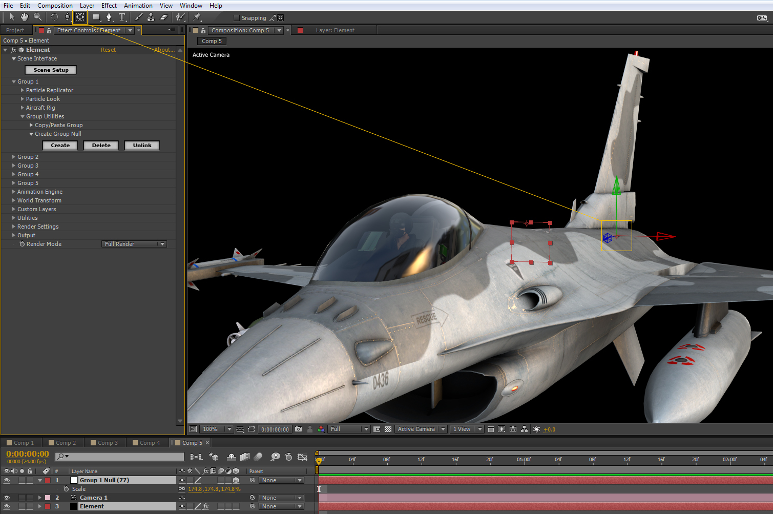 [Create a Group Null](https://www.videocopilot.net/help/element/help_files_v2/4/90/#create_group_null) and move the Anchor Point with the pan behind tool to offset it. Changing viewports can help visually to see where you are moving it.
