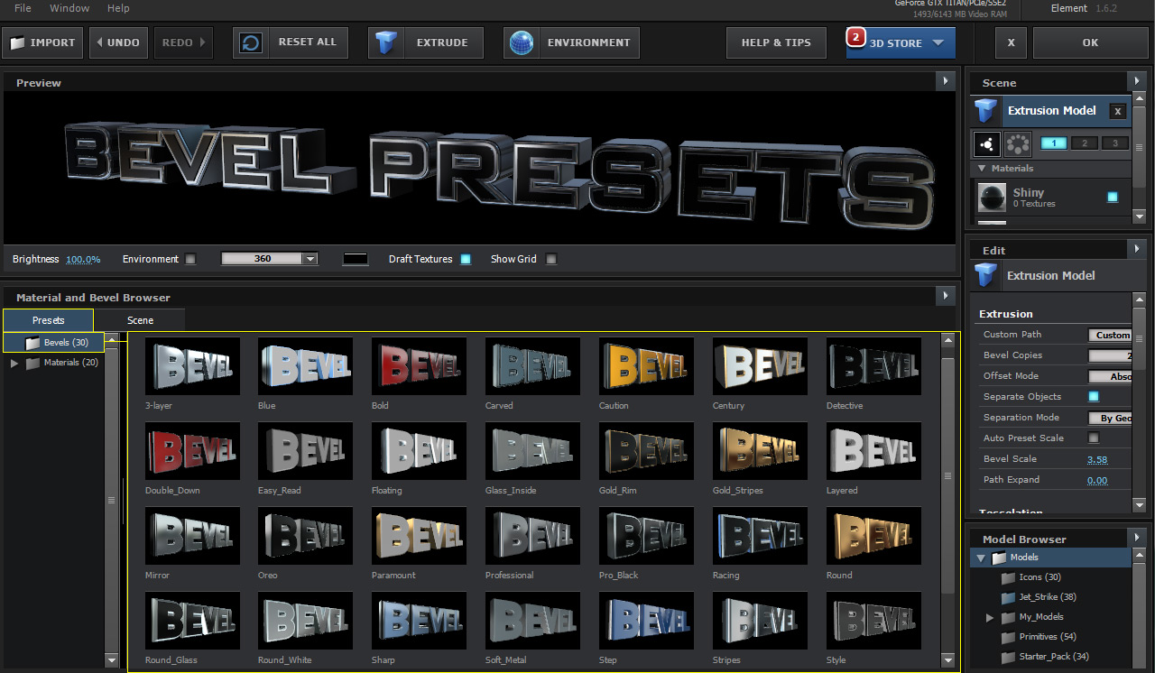 In the Material and Bevel Browser there is a preset tab that has a folder with 30 Bevel Presets. Drag a preset to an extrusion model to apply it. You can also right click to add to an extusion. Save a Bevel Preset by right clicking on the extrusion model and it will save your extrusions and materials settings.