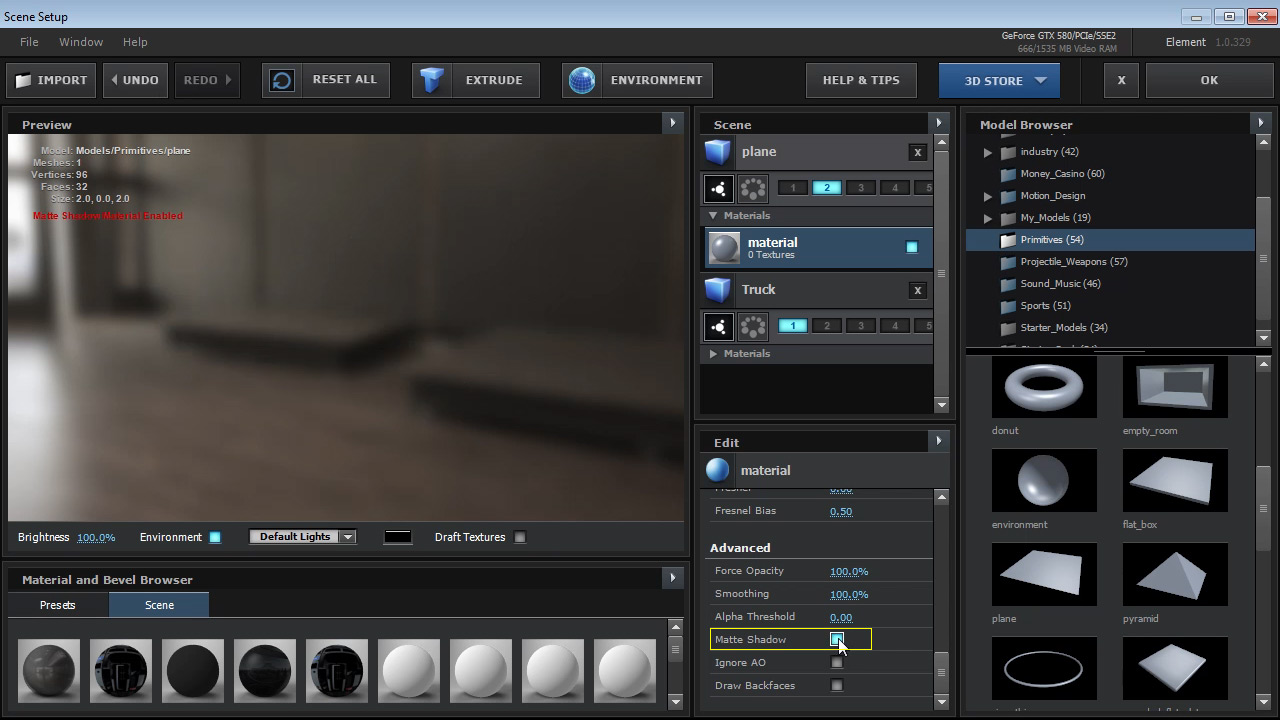 Control the amount of ambient occlusion this material will use on the polygons it is mapped to in relation to the main ambient occlusion settings in Element effects control panel render settings.