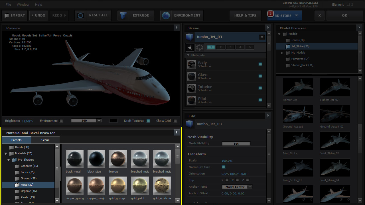 The Presets tab are pre-made materials and bevels that are either default from Element, from the Pro Shaders material pack, or custom saved by the user. (Saving Presets below).