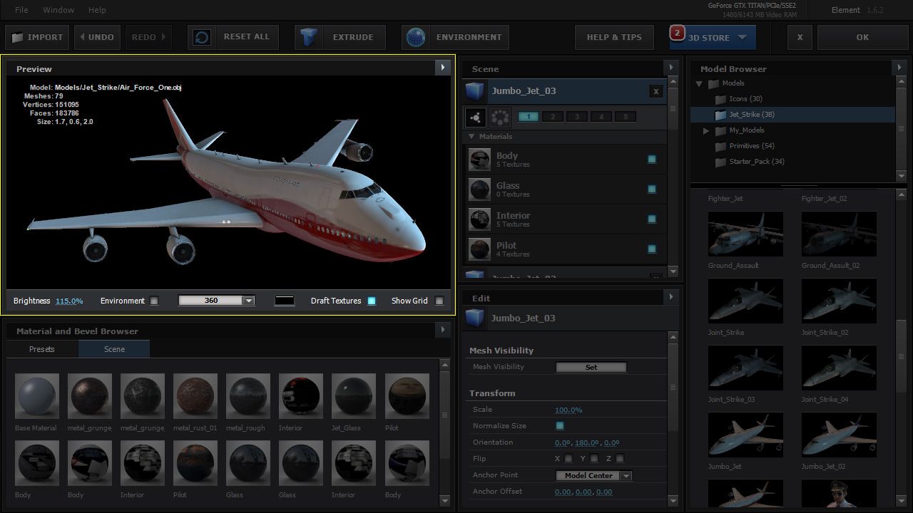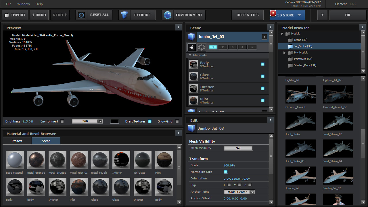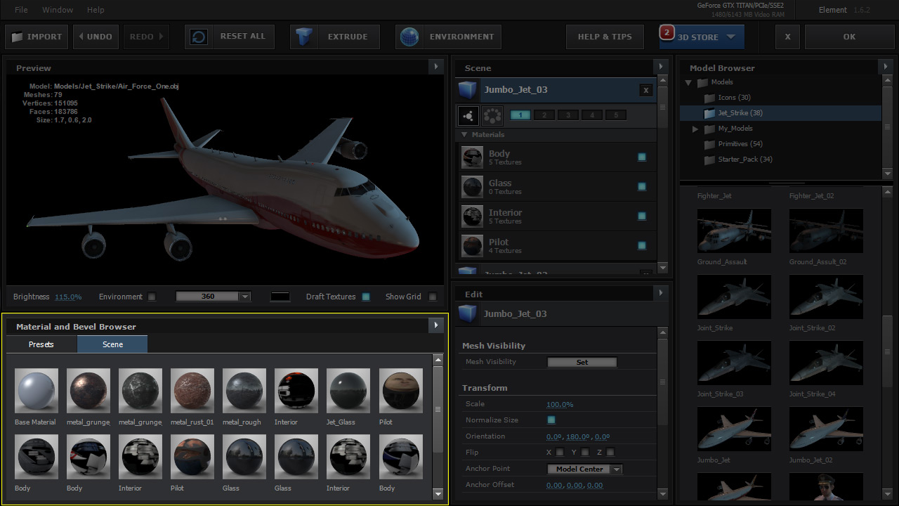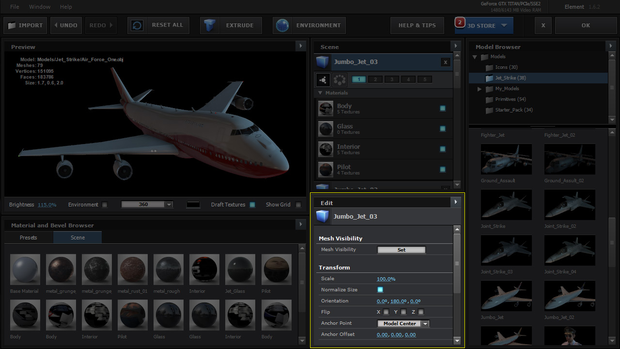 The Edit and Scene panel work very hand in hand. You can click on the model name in the Scene panel to adjust the model settings in the Edit plane such as the Anchor Point and Model and Surface Mapping. You can click on the material slots in the Scene panel to adjust the material settings in the Edit panel such as adding texture maps from files, or adjusting reflection.