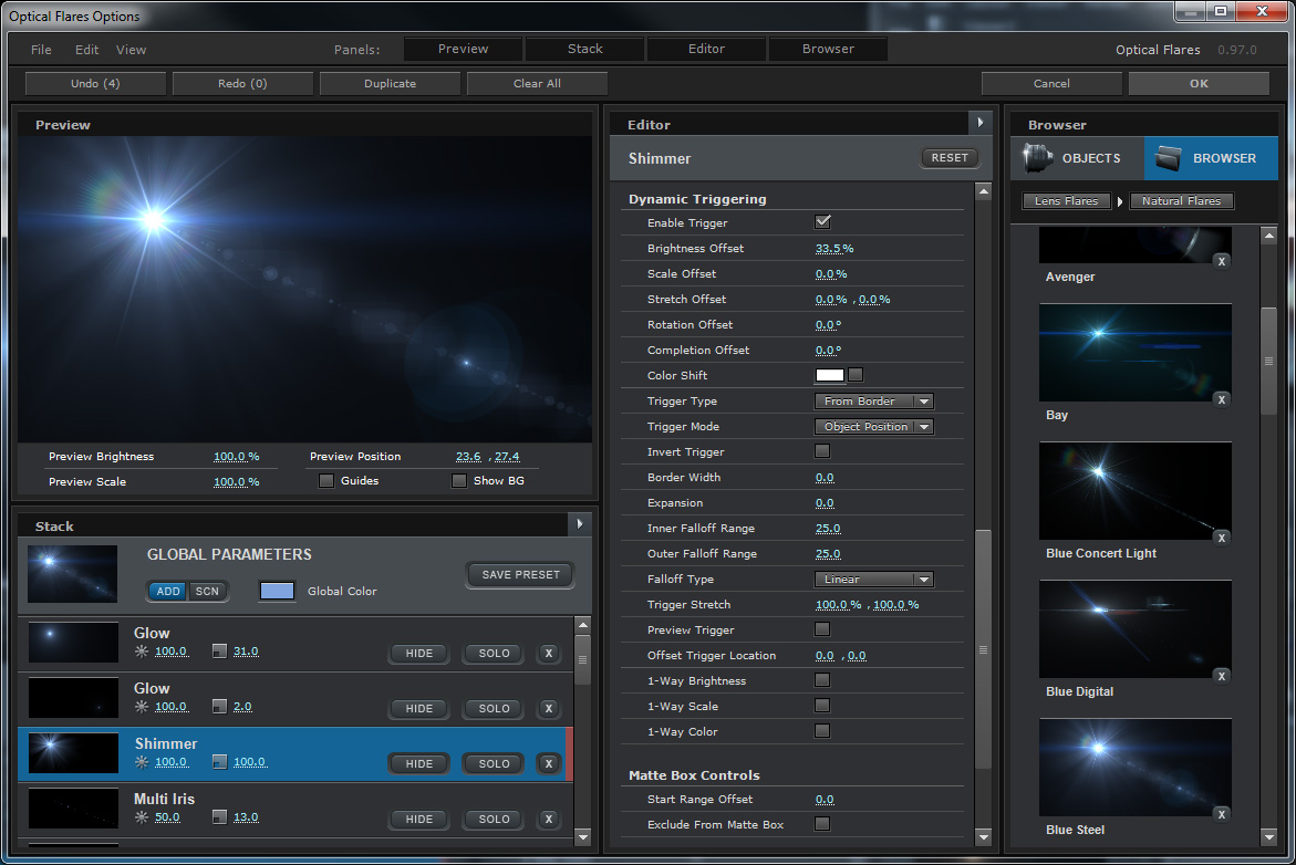 The dynamic Triggering controls are found at the bottom of each lens object to help automate procedural animations without keyframes.